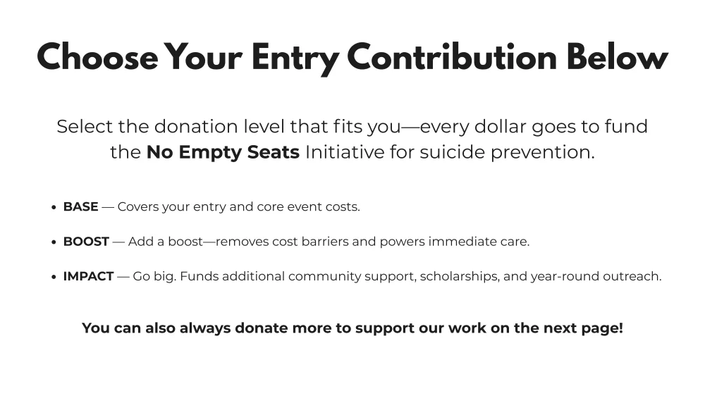 All proceeds from this tournament go directly to life-saving care for people battling suicidal ideation. Your registration, sponsorship, or donation funds immediate access to support—not someday, but now.